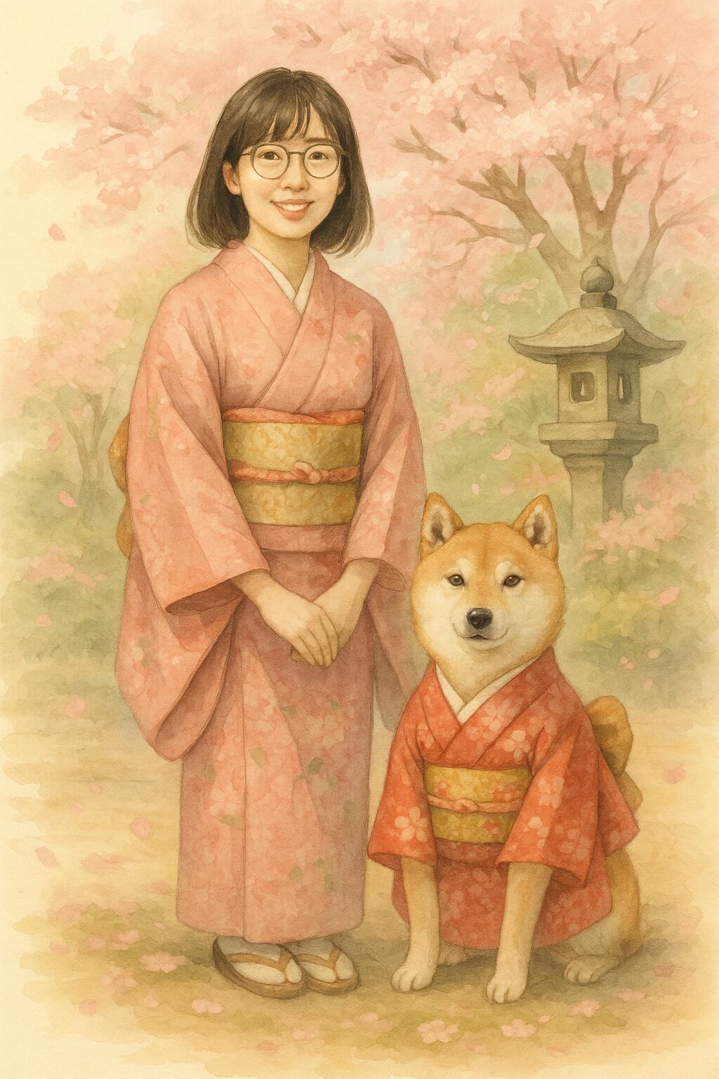 和装のあなたとペットの姿を、水彩スタイルで優しく描いた肖像画です。