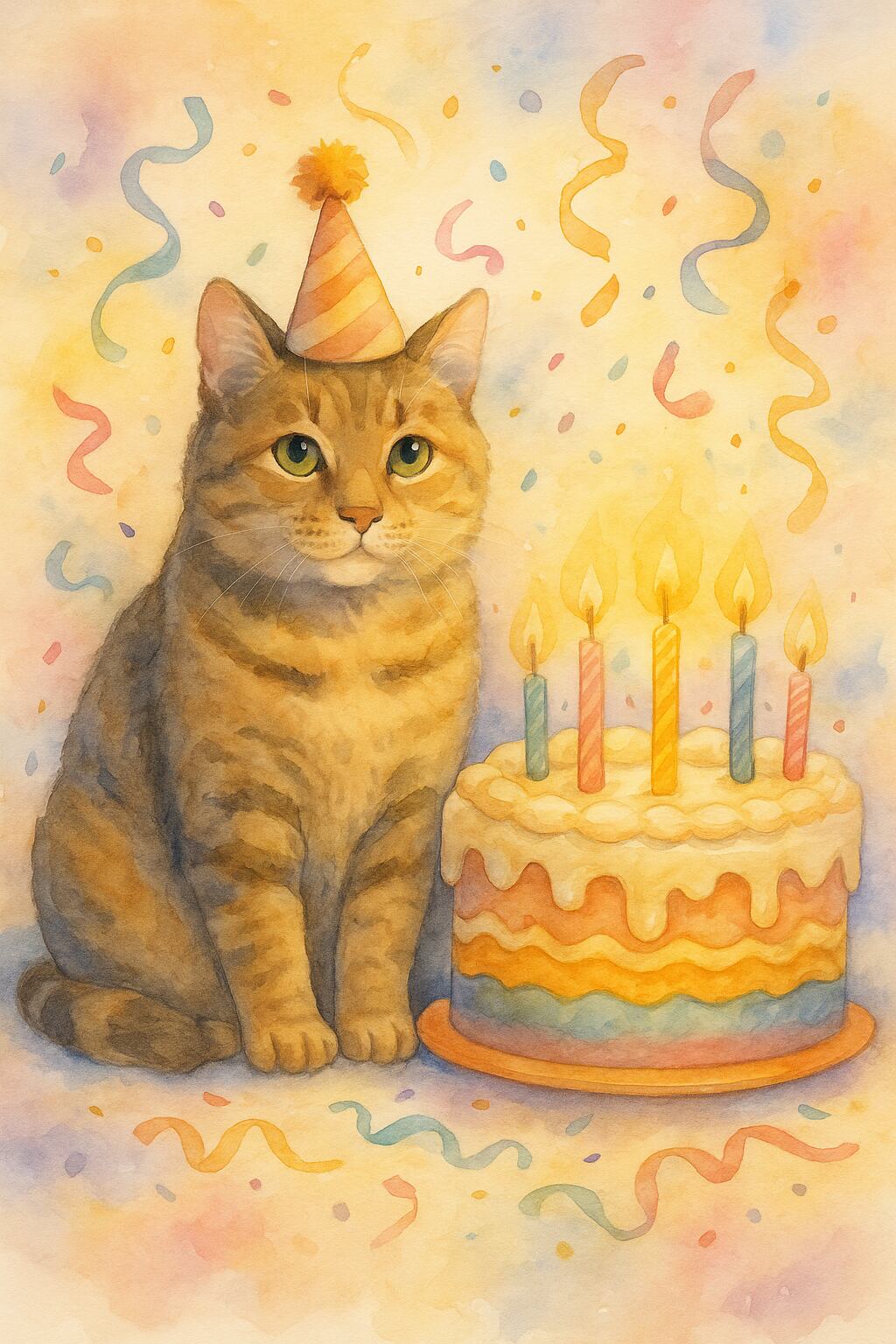 ろうそくが灯ったカラフルな誕生日ケーキの横に、パーティーハットをかぶってちょこんと座る姿がたまらなく愛おしい──そんな水彩画風の肖像データをお届けします。